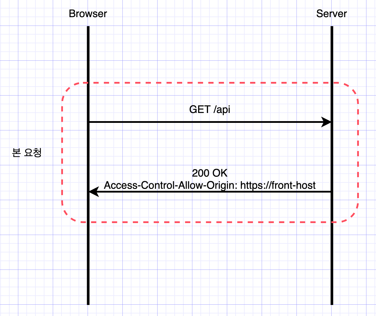 - SOP정책을 사용하는 경우 서로 다른 도메인에 대한 요청을 보안상 제한하기 때문에 CORS를 위한 응답 헤더를 통해 다른 도메인에 대한 요청을 허용하도록 해야 함